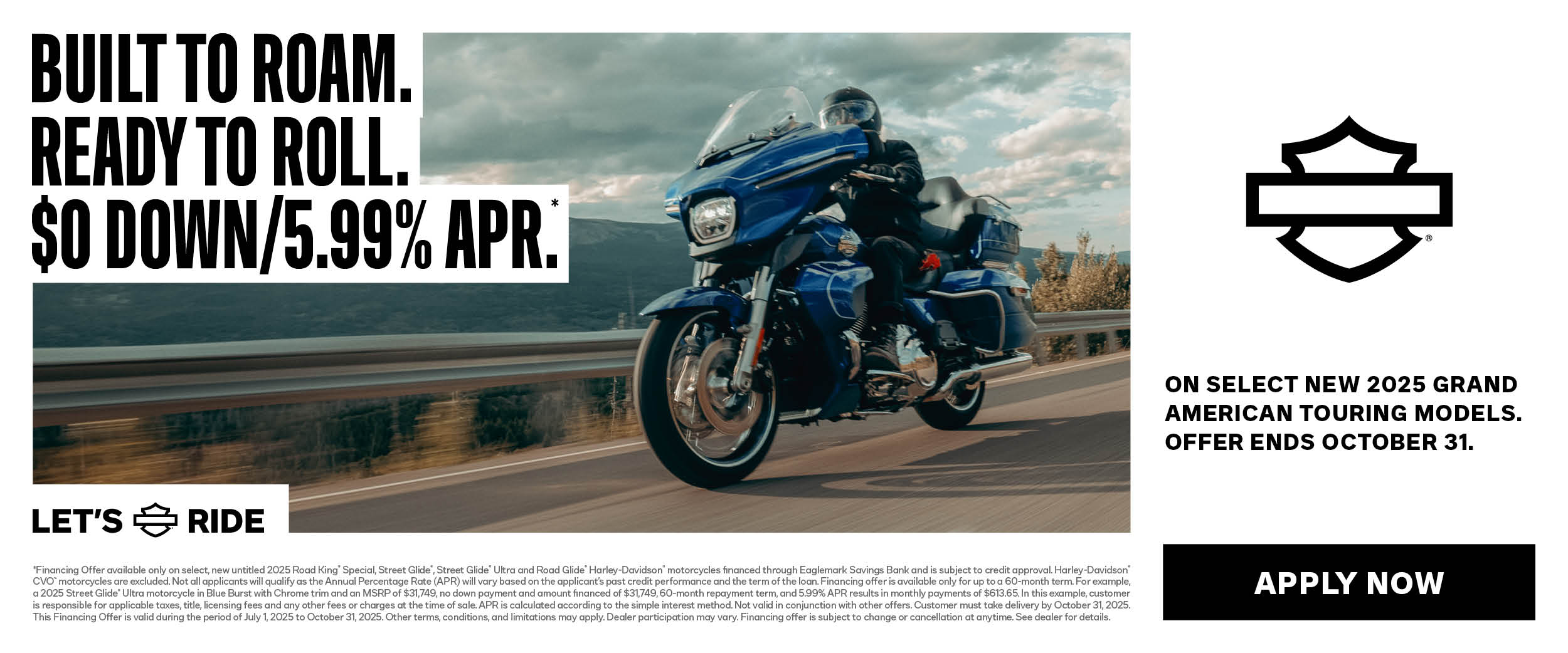 Riding High Harley-Davidson® offers competitive motorcycle financing rates and terms on all of our new and used Harley-Davidson® motorcycles. Our Harley-Davidson® financial experts are here to guide you through the motorcycle financing process so you can quickly get out on the open road and start riding.